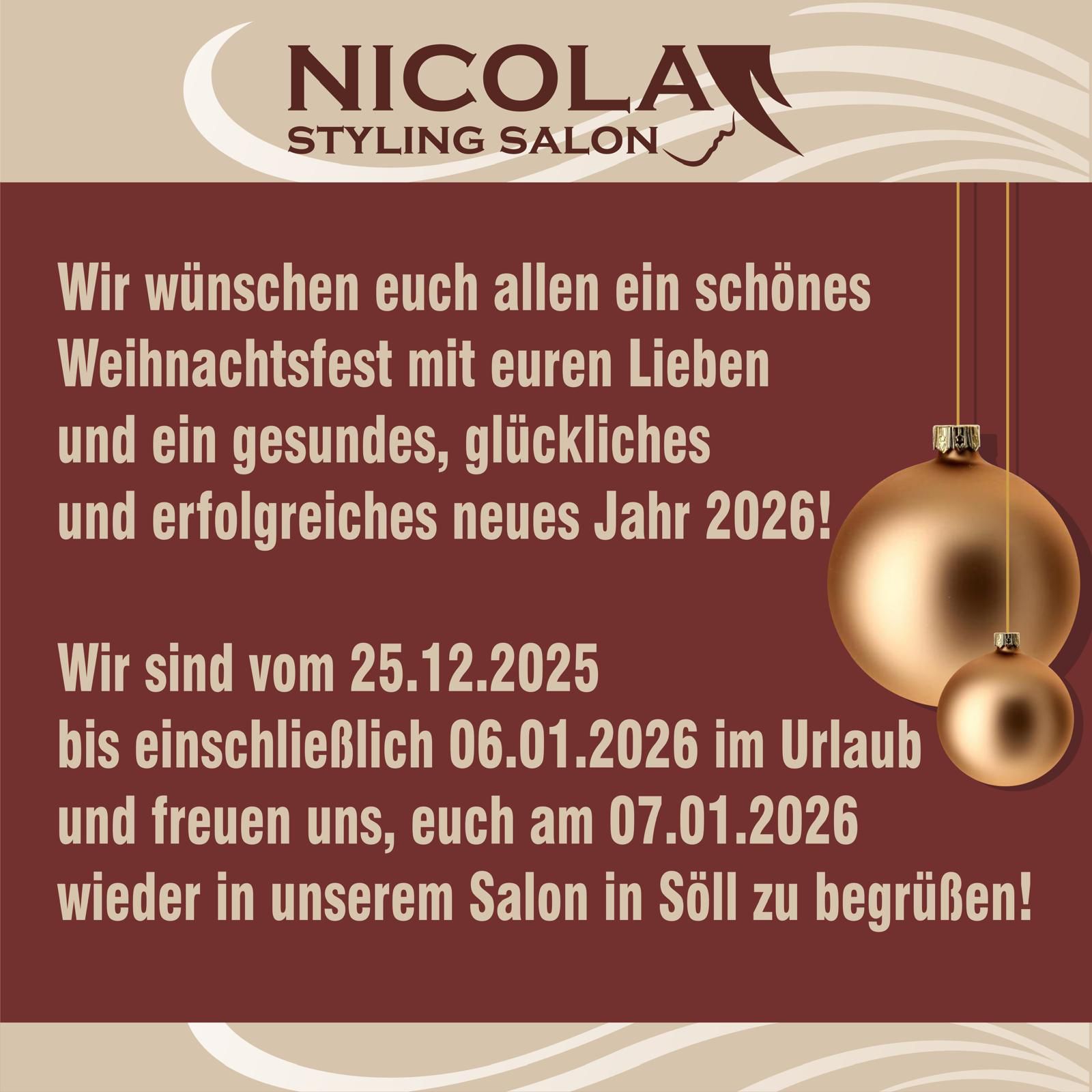 Dienstag und Mittwoch 8-18 Uhr | Donnerstag und Freitag 8-19 Uhr | Samstag, Sonntag und Montag ist RuhetagWir sind von 25.12.2026 bis einschließlich 8.1.2026 im Urlaub und freuen uns, euch ab 7.1.2026 wieder in unserem Salon begrüßen zu dürfen!